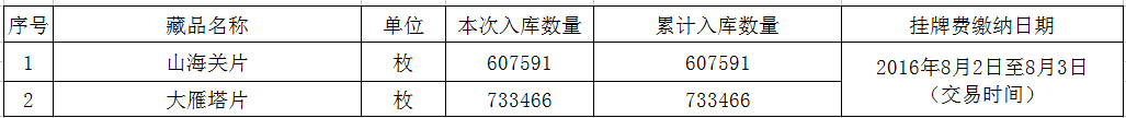 您的當(dāng)前位置: 首頁 > 托管公告 > 出入庫公告 >2016(托)第198號 《大雁塔片》等藏品托管入庫公告