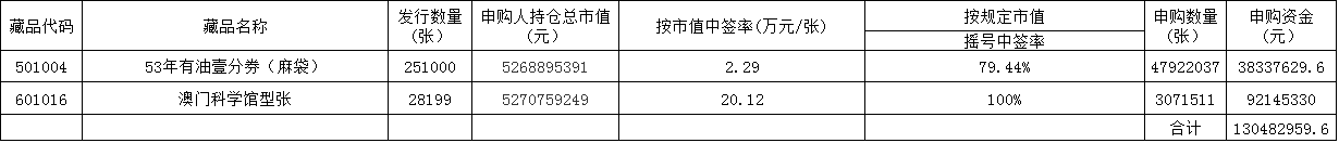 《53年有油壹分券(麻袋)》等藏品申購中簽公告