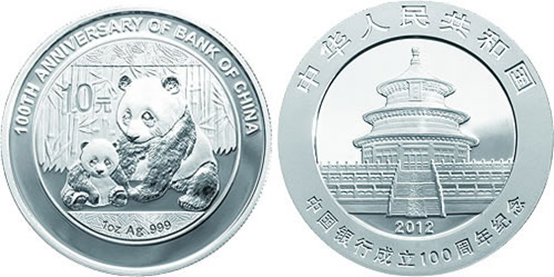 【簡(jiǎn) 介】:中國(guó)銀行成立100周年熊貓加字銀幣于2012年4月26日由中國(guó)人民銀行發(fā)行,為中華人民共和國(guó)法定貨幣。