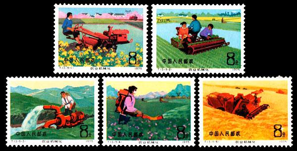 為了反映中國農(nóng)業(yè)機械化的水平,中華人民共和國郵電部1975年12月15日發(fā)行《農(nóng)業(yè)機械化》特種郵票,全套5枚。潘可明設(shè)計。