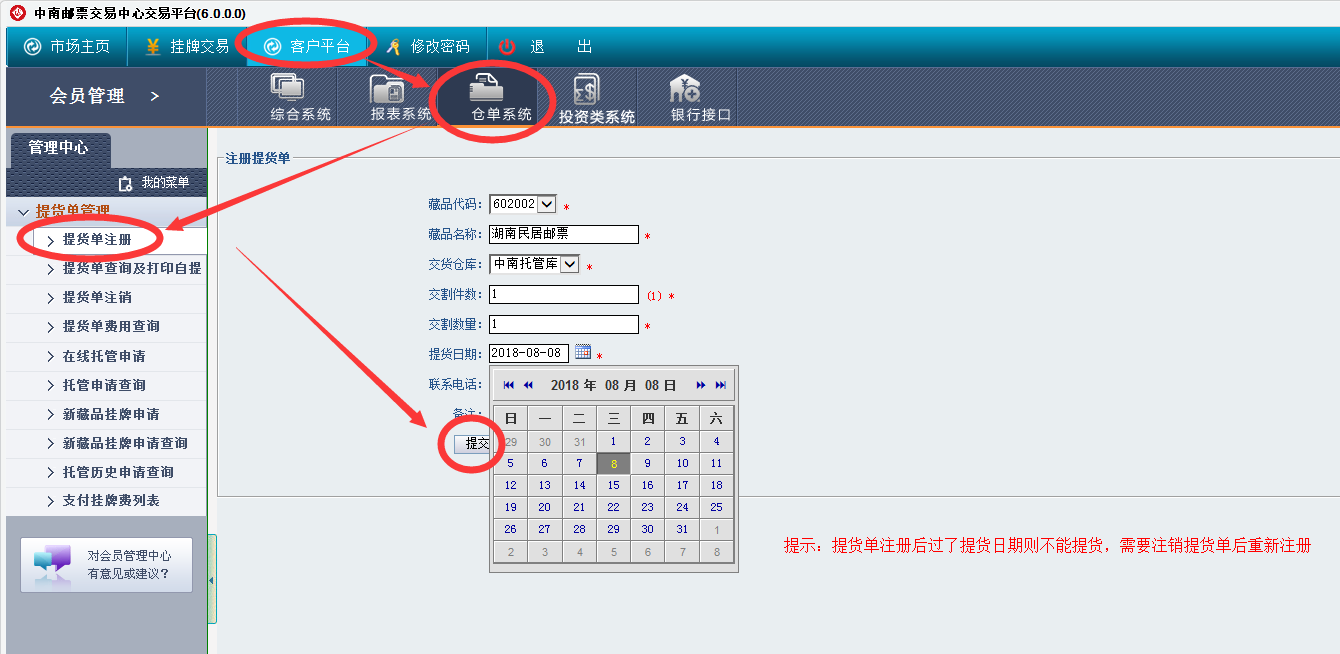 2、客戶端——客戶平臺——倉單系統(tǒng)——提貨單注冊:(提貨日期填寫上述預(yù)約日期)