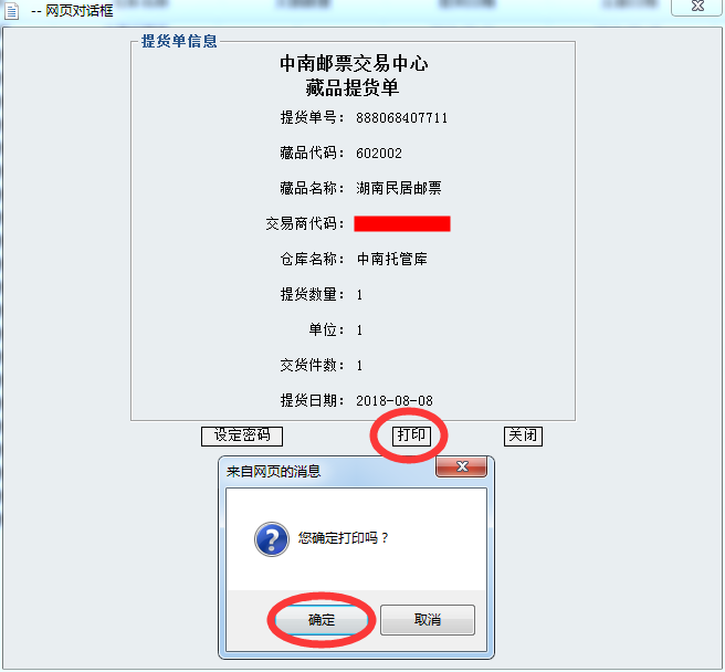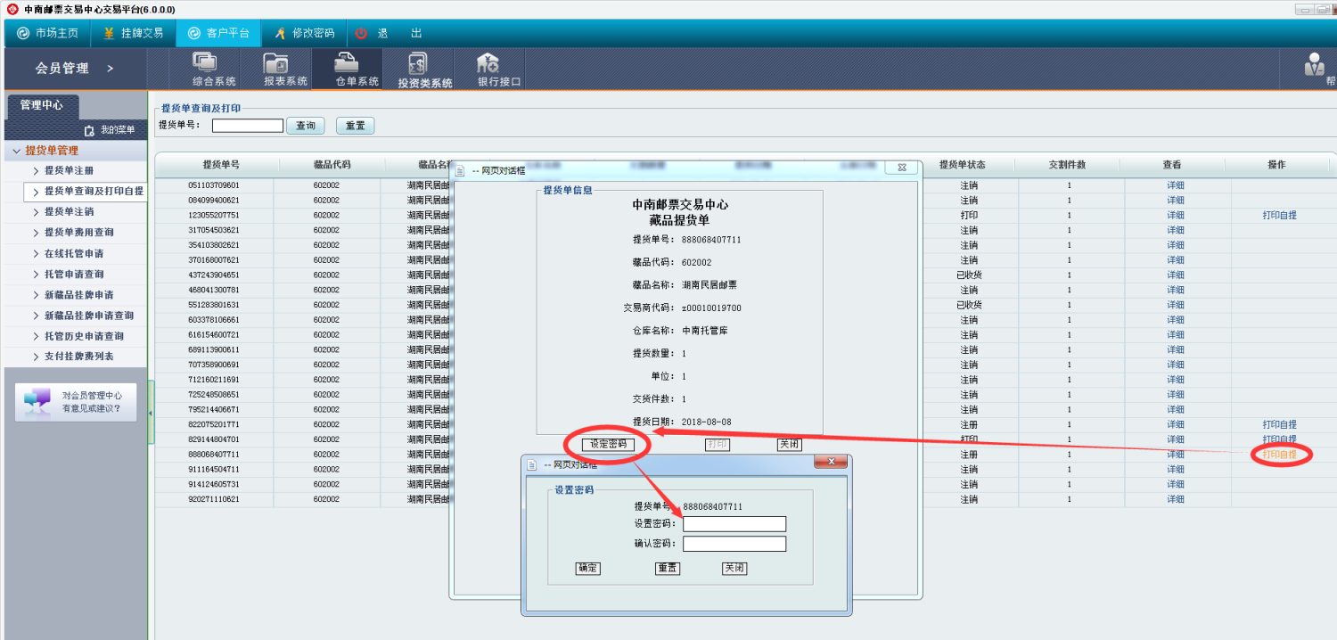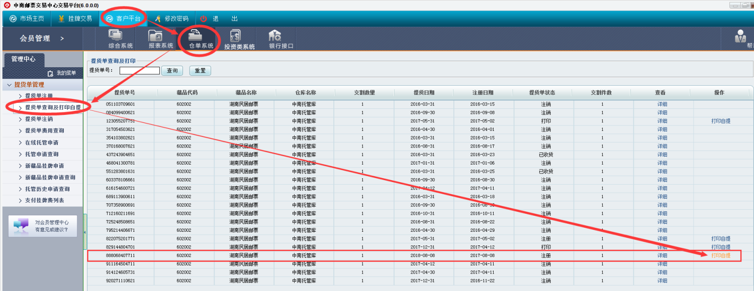 3、客戶端——客戶平臺——倉單系統(tǒng)——提貨單查詢及打印自提: