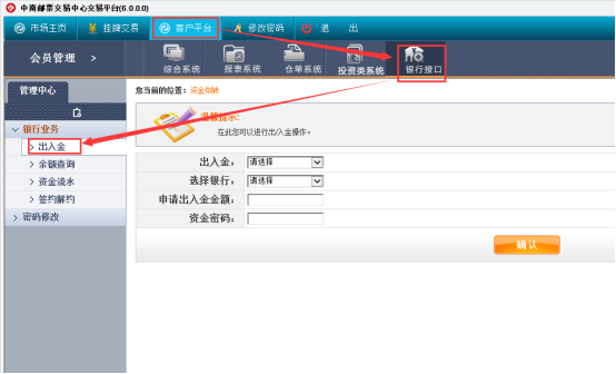 第三步,銀行業(yè)務(wù)下面的出入金,選擇 出金\入金 選項,輸入出入金金額和資金密碼,點擊確定。任意一筆出入金均可在“資金流水”查詢出入金記錄,出入金記錄中可以查詢該筆流水的狀態(tài)。