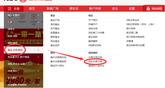 第二步,點擊【基金 證券 期貨】—【銀商銀權】-【我的交易市場】菜單;