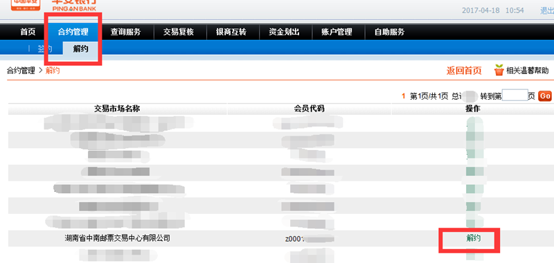 第二步,選擇【合約管理】-【解約】,選擇【湖南省中南郵票交易中心有限公司】,點(diǎn)擊【解約】