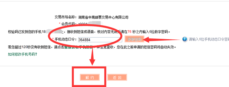 第三步,核實(shí)交易市場(chǎng)信息,輸入手機(jī)動(dòng)態(tài)口令,點(diǎn)擊解約。