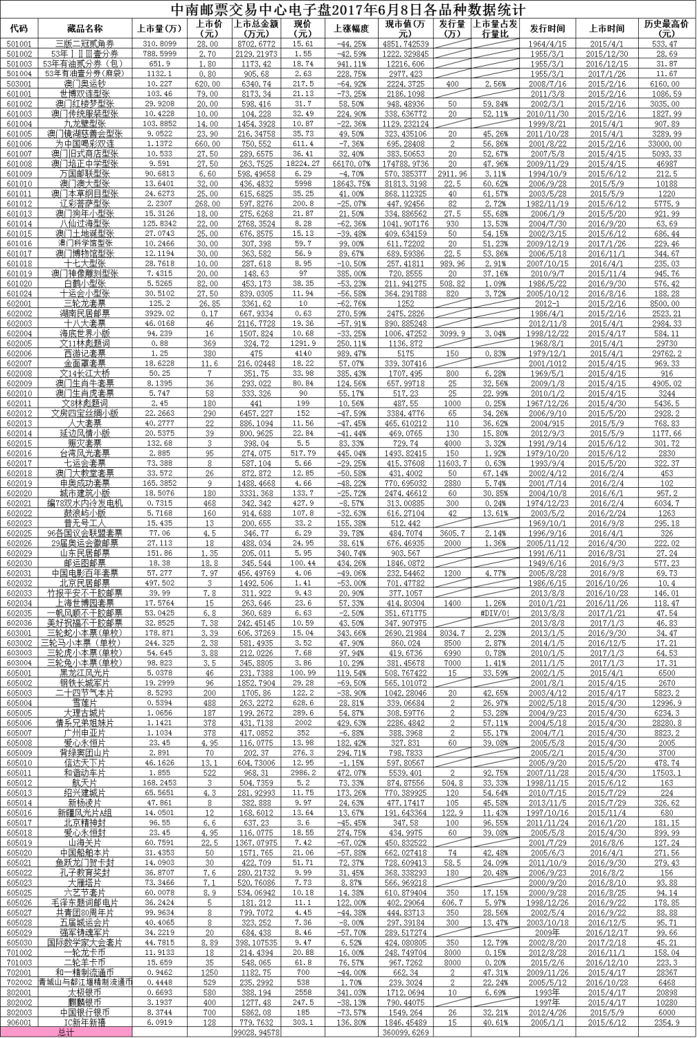 您的當(dāng)前位置: 首頁(yè) > 交易數(shù)據(jù) > 藏品市值 >中南郵票交易中心電子盤(pán)2017年6月8日各品種數(shù)據(jù)統(tǒng)計(jì)