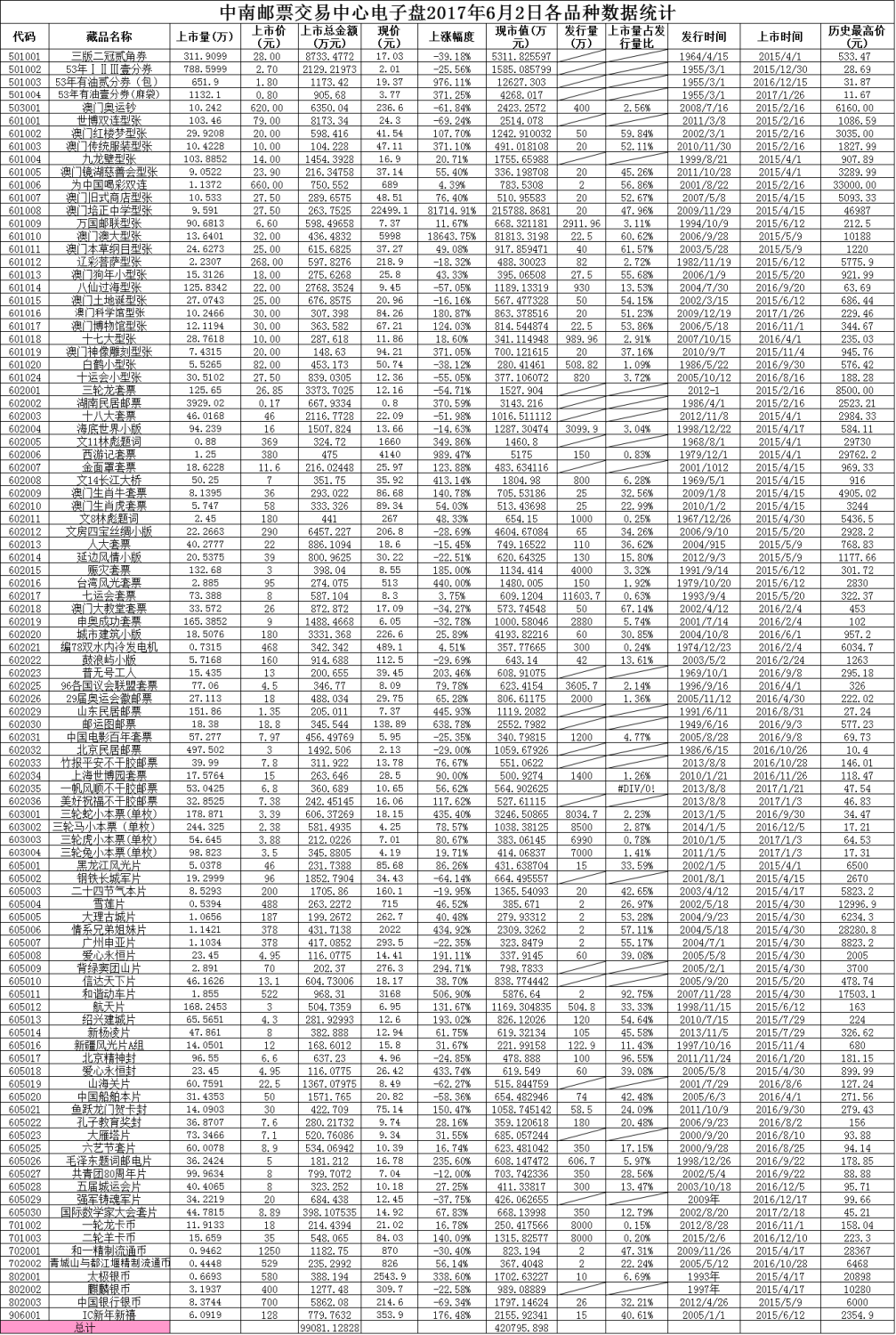 您的當前位置: 首頁 > 交易數(shù)據(jù) > 藏品市值 >中南郵票交易中心電子盤2017年6月2日各品種數(shù)據(jù)統(tǒng)計